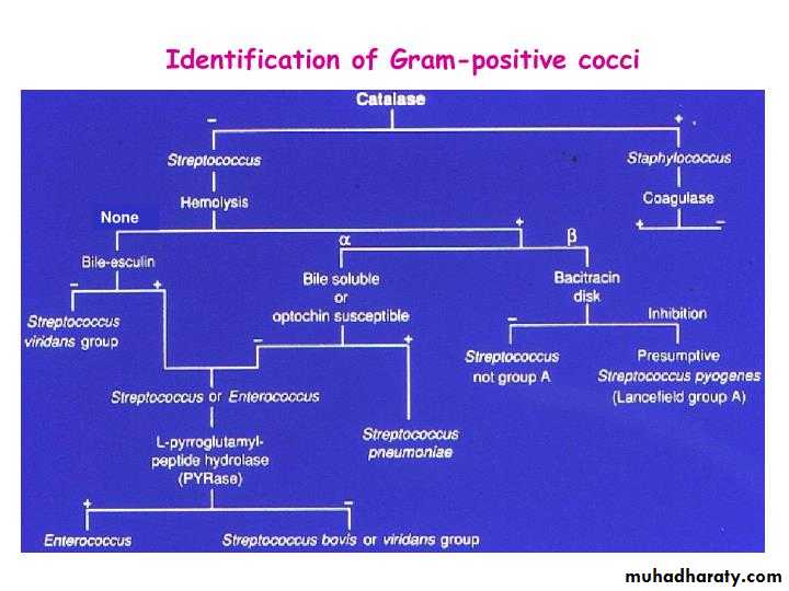 • Streptococci (catalase –ve) while, Staphylococci (catalase +ve)