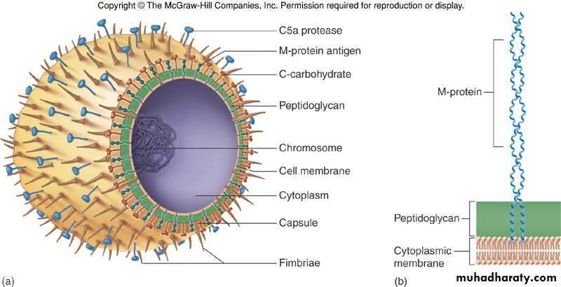(1)Protein M is a major virulence factor for the group A streptococcus. it’s a hair like projections of streptococcal cell wall. It inhibits the activation of complement and protects the organism from phagocytosis. However, it is also the weakest point in the organism's defense, because plasma cells generate antibodies against the M protein. These antibodies bind to the M protein (opsonization), aiding in the destruction of the organism by macrophages and neutrophils.