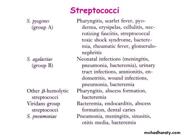 • Group A: Streptococcus pyogenes• primary important pathogen for human cause infections, (respiratory system, systemic and skin).