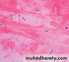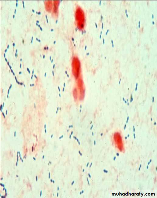 • show many polymorphonuclear, neutrophiles and many RBC. direct smear stained by gram stain, show G+ve diplococci lancet–shaped, there is unstained halo around the organism which represent its capsule
