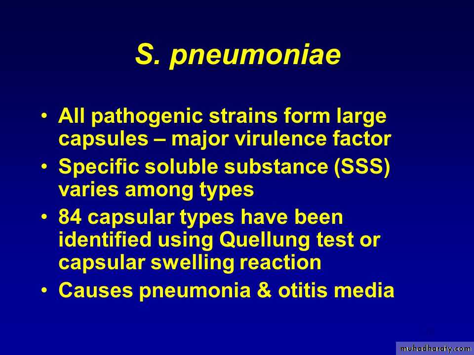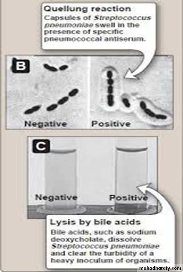 • 3- Capsular swelling (the Quellung reaction) is observed when sputum treated by type-specific antisera as immunological test.