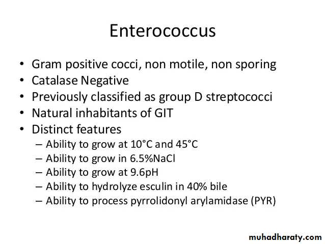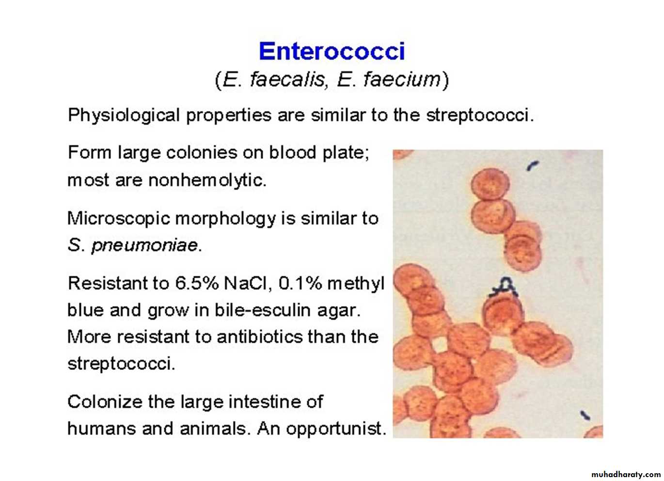 Enterococcus (E.faecalis, E.faecium):• It can grow on ordinary media and also on macConkey’s on which it gives deep pink colonies.
