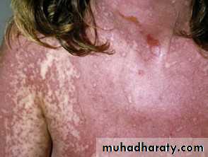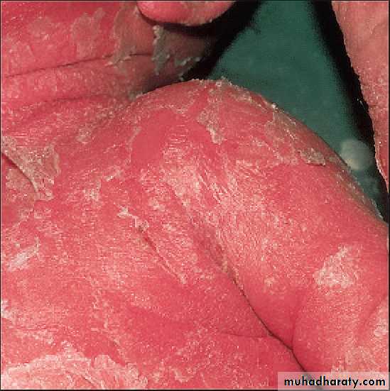 *Scalded skin syndrome involves the appearance of superficial bullae resulting from the action of an exfoliative toxin that attacks the intercellular adhesive of the stratum granulosum, causing marked epithelial desquamation.