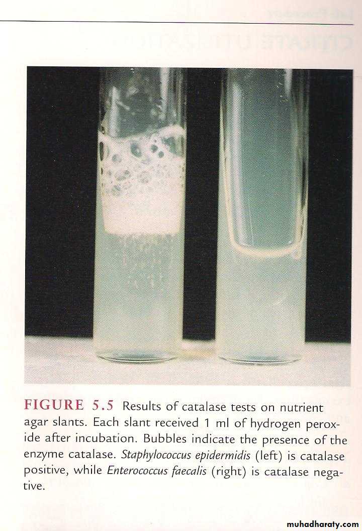 1-The staphylococci produce catalase, which differentiates them from the streptococci.2-Staphylococci slowly ferment many carbohydrates, producing lactic acid but not gas.