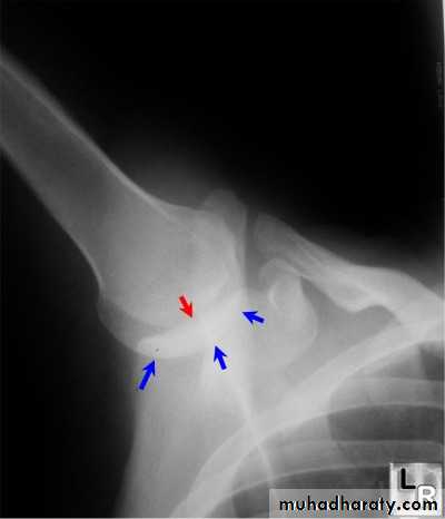 * Posterior dislocation may be missed initially on frontal radiographs in 50% of cases, as the humeral head appears to be almost normally aligned with the glenoid.