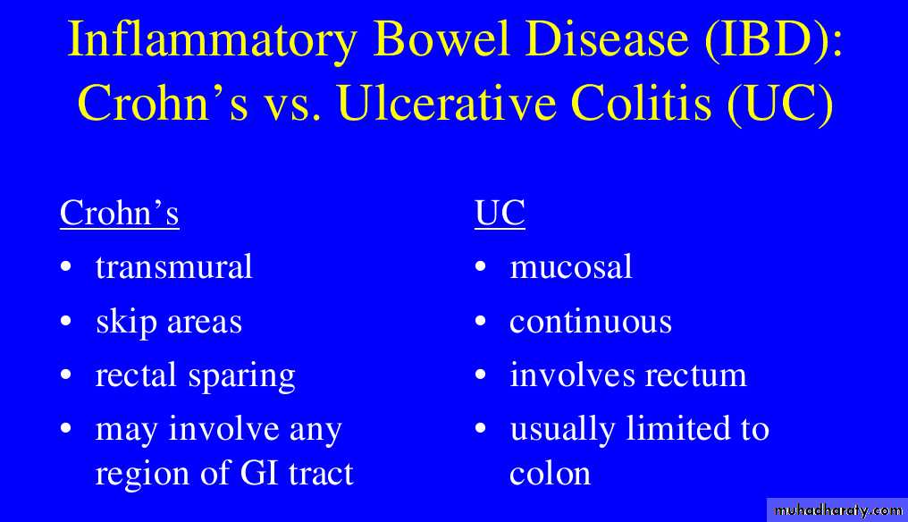 Due to the overlap in clinical presentation of Crohn's disease (CD) and ulcerative colitis (UC), imaging often has a role to play in distinguishing the two. Distinguishing features include:bowel involved