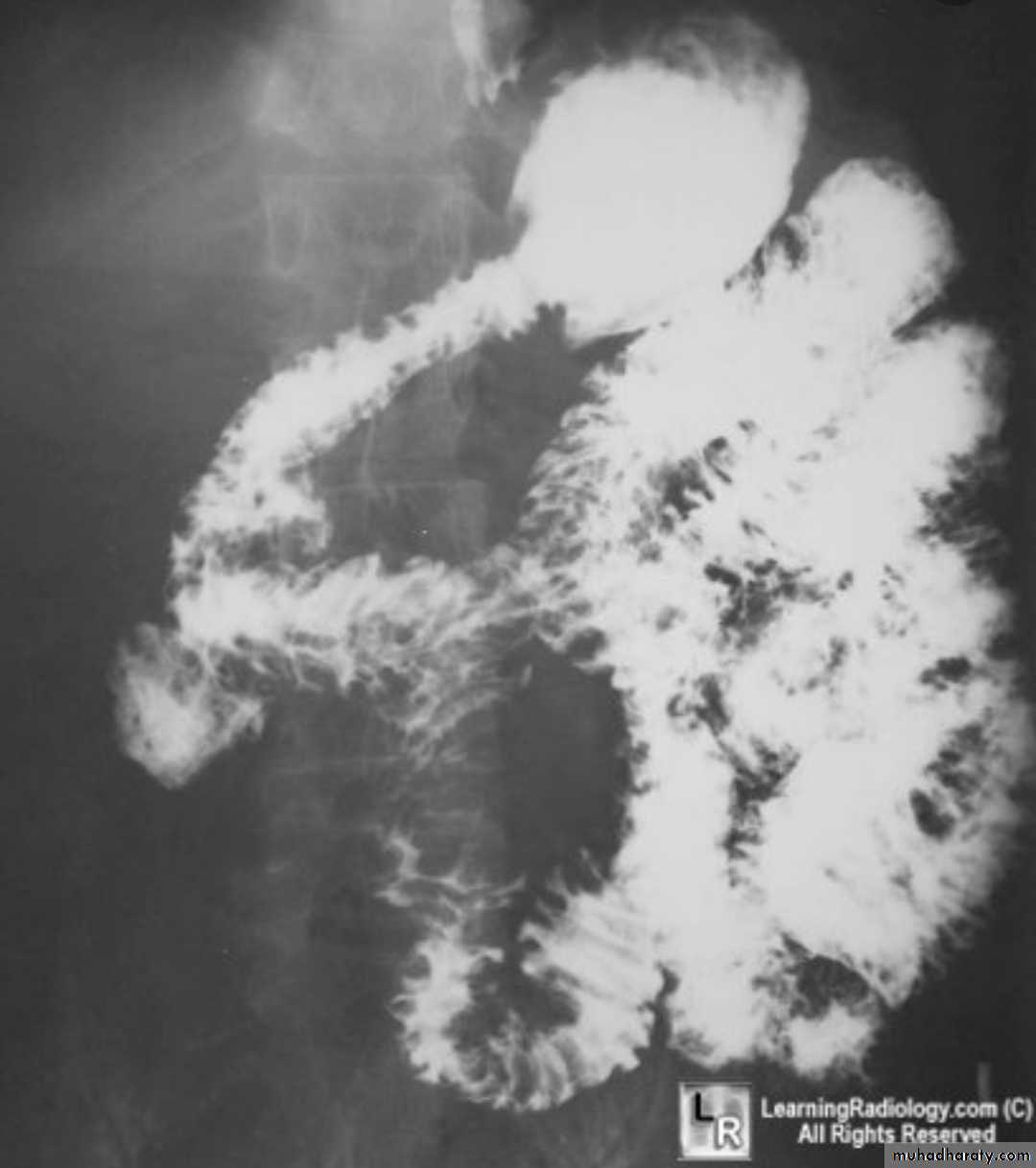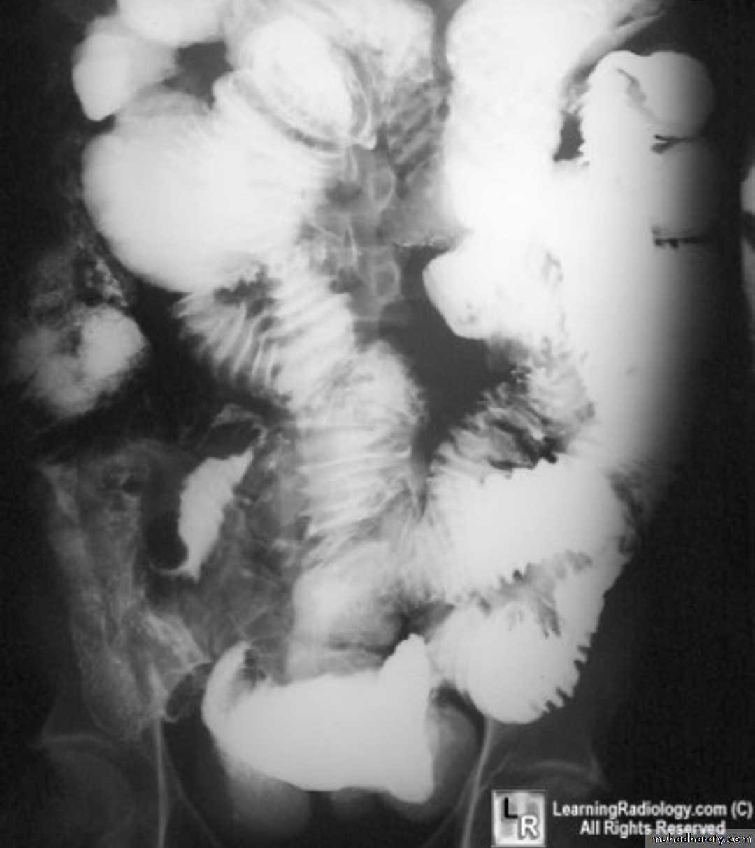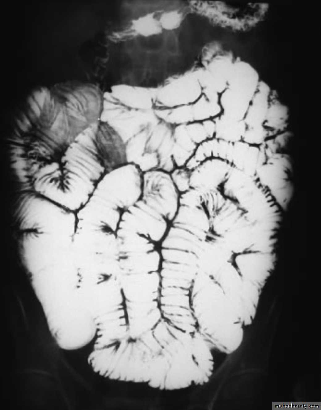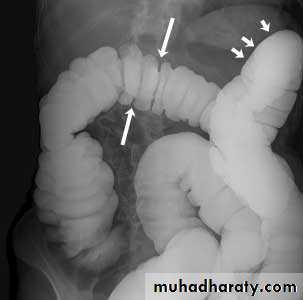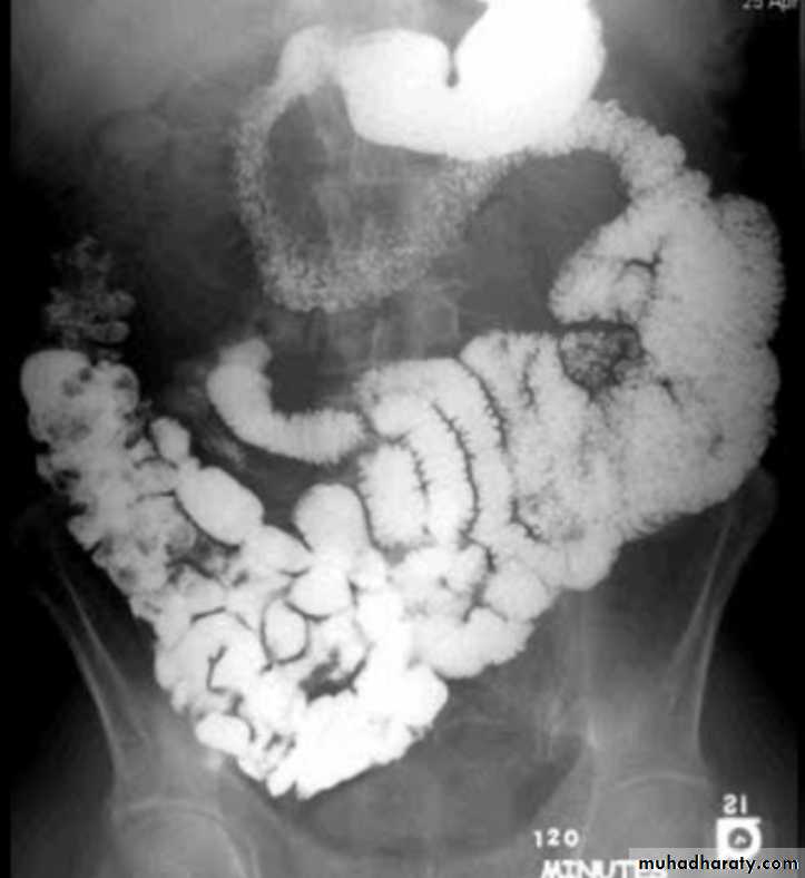 Ba follow through findingsLoss of normal small bowel feathery appearance .