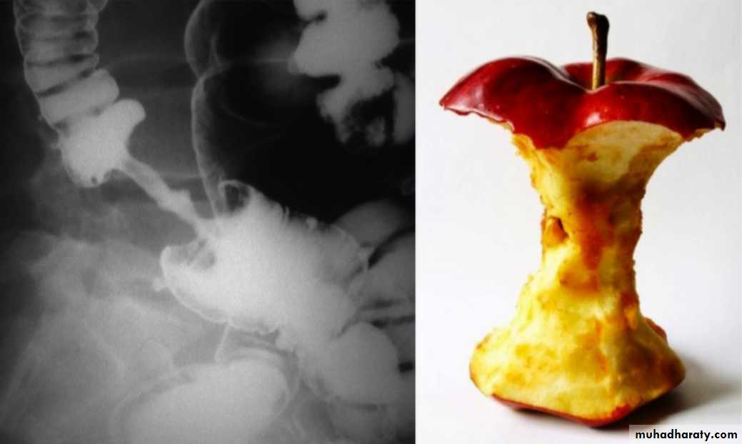 1. infiltrative ( Apple core sign ) lesion infiltrate bowel wall from outside