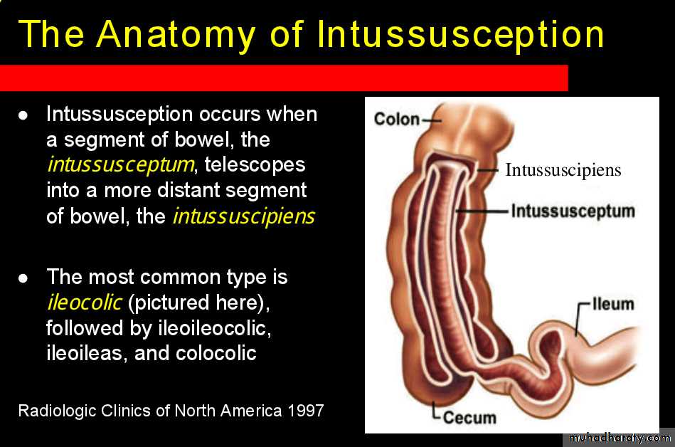 Intussusceptions can occur essentially anywhere, in children there is a strong predilection for the ileo colic region
