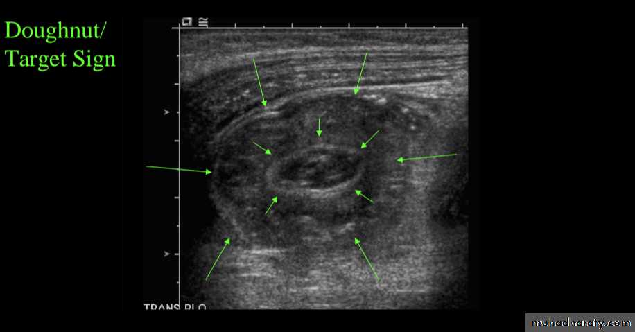 is a reliable screening tool for children at low risk for intussusceptionsUltrasound signs include: