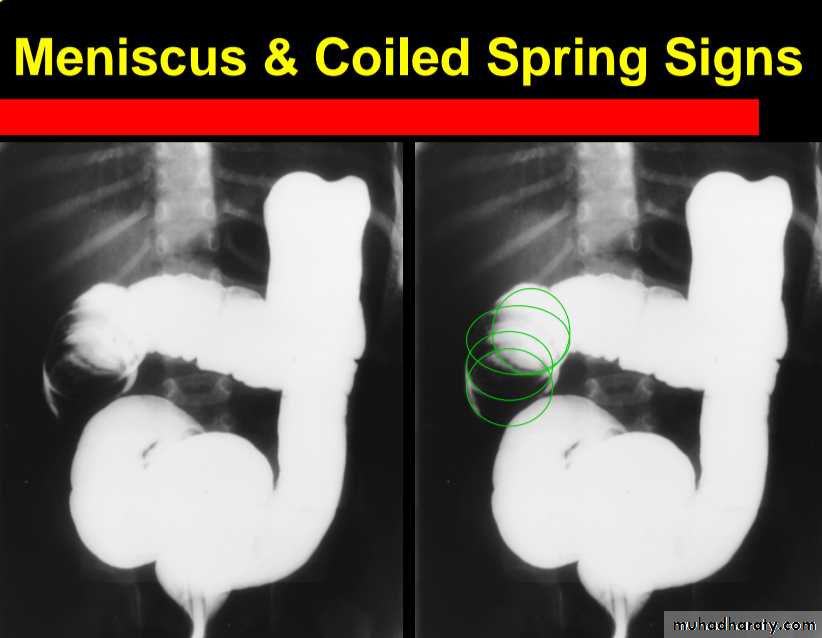 A contrast enema remains the gold standard, demonstrating the intussusceptions as an occluding mass prolapsing into the lumen, giving the "coiled spring ” appearance .The main contra-indication for an enema is a perforation