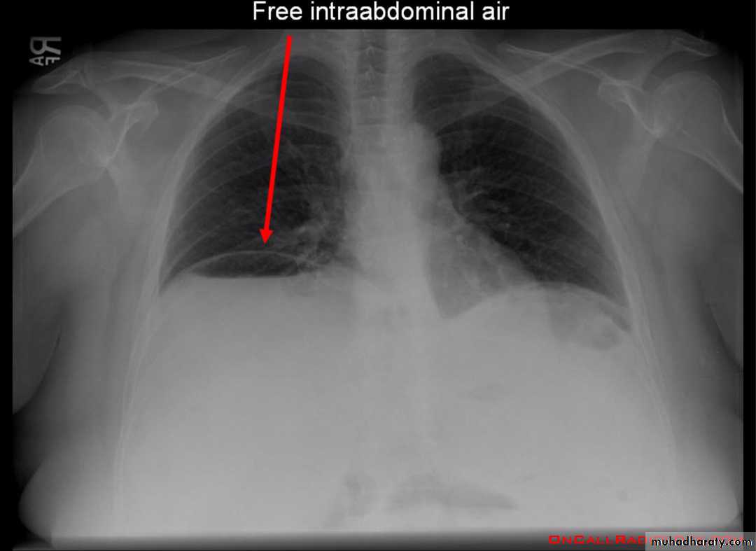 An erect chest x-ray is probably the most sensitive plain radiograph for the detection of free intra peritoneal gas as crescent shape of lucency below diaphragm , more in the RT sided aspect .