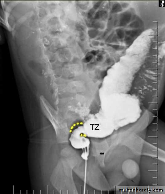 A carefully performed contrast enema is indispensable in both the diagnosis of Hirschprung disease but also in assessing the length of involvement. It should be noted however that the depicted transition zone on the contrast enema is not accurate at determining the transition between absent and present ganglion cells.
