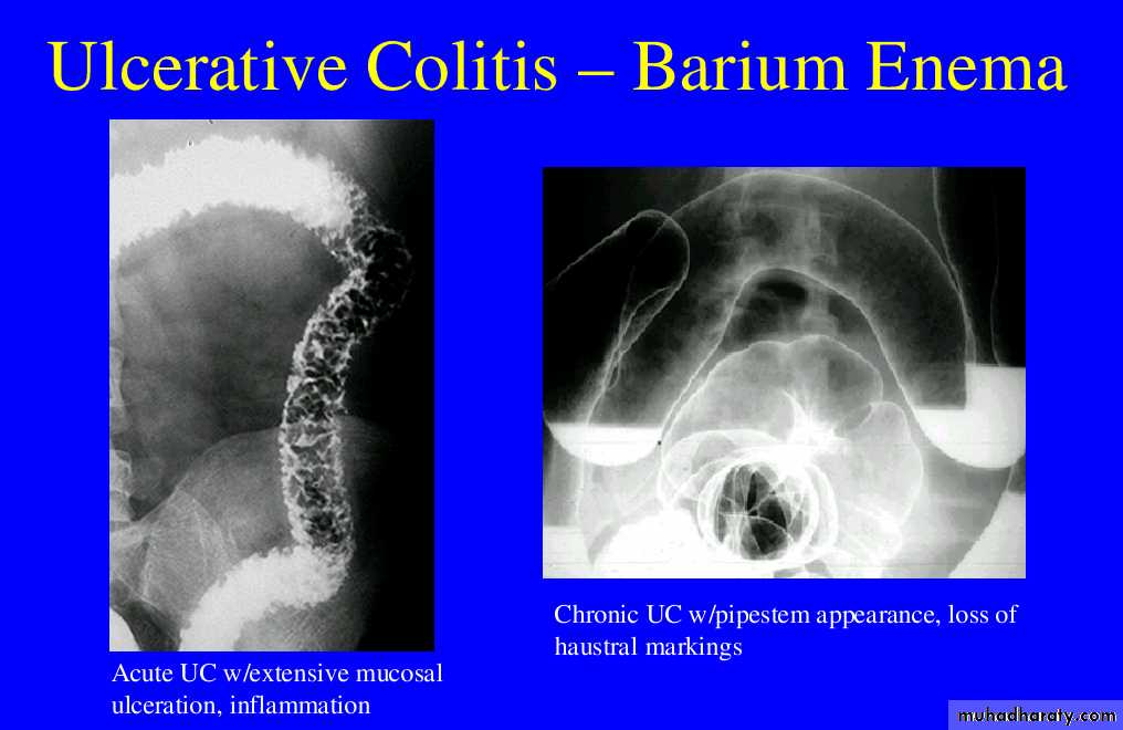 In the small intestine, a barium exam may reveal:Inflammatory bowel disease ( CD & UC )