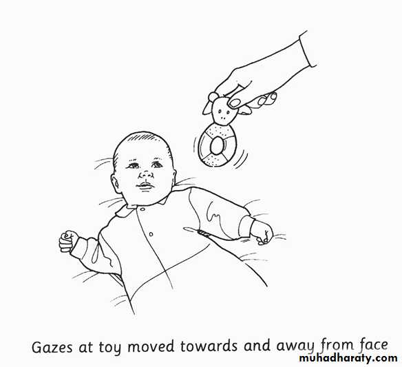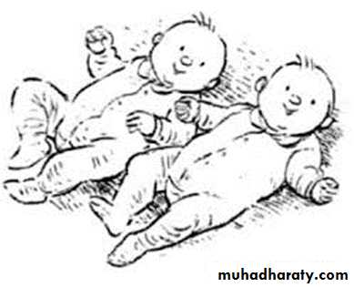 Moro reflex : any sudden movement which cause head extension (gives the baby the feeling that he may be dropped) causes extension following by flexion of the arms and legs.An asymmetric response may signify a fractured clavicle, brachial plexus injury, or a hemiparesis on the side of the poorly abducted arm).