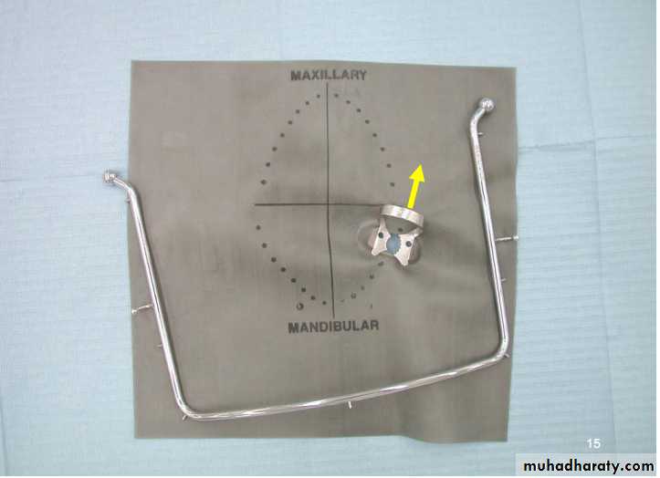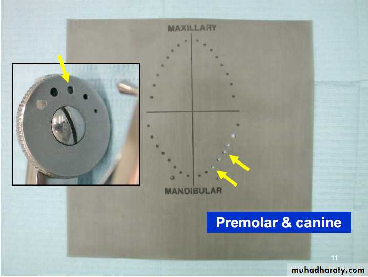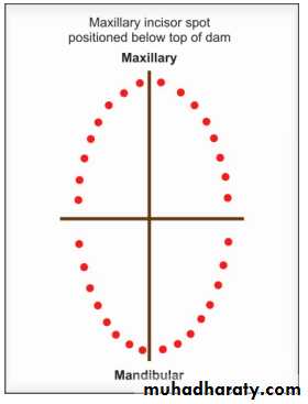 The cusp tips of posterior teeth and incisal edges of anterior teeth can be visualized through the dam, and the centers of the teeth are marked on the dam with a pen