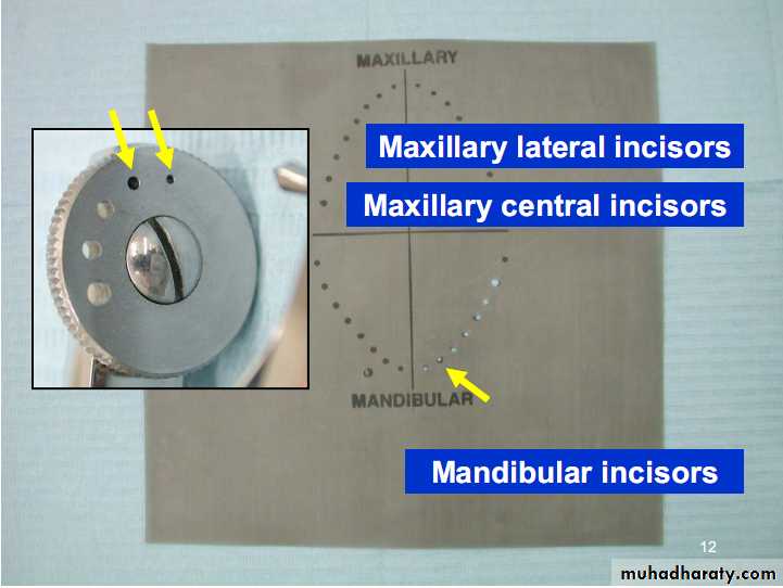 Holes in each template correspond to tooth positions. The template is laid over the dam, and a pen is used to mark through selected holes onto the dam.