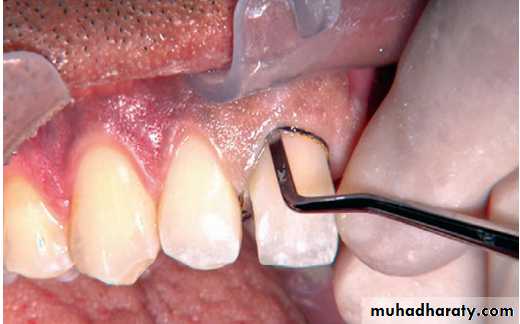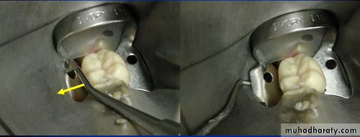 While tucking cordinto the sulcus, applyslight forcelaterally and angulated towards tooth surface
