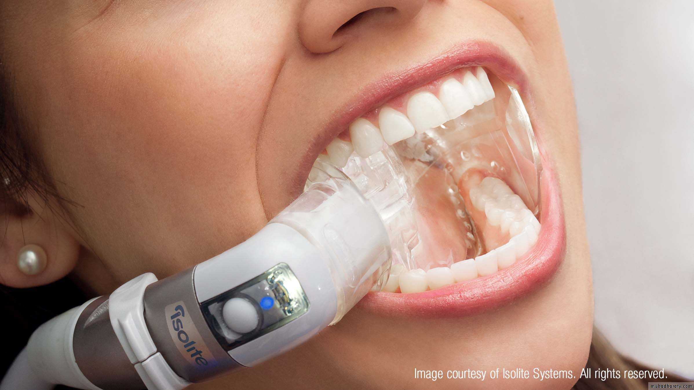 The Isolite (Isolite Systems) is a newer isolation device that provides illumination in addition to suction, retraction of tongue and cheek, and an integrated bite blockIt is relatively simple to use and comfortable for the patient. Single-use mouthpieces come in six sizes