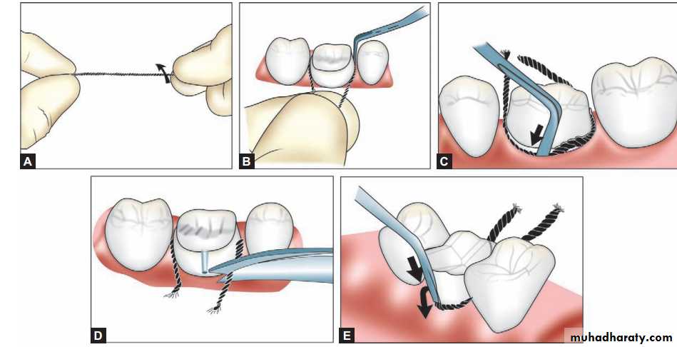 around the tooth and pushed into the sulcus; (D) Extra cord is cut off; (E) Remaining cord piece is tucked into the sulcus