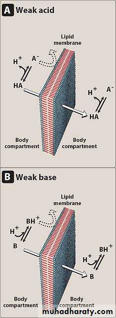 Thus, for a weak acid, the uncharged HA can permeate through membranes, and A⁻ cannot.For a weak base, the uncharged form, B, penetrates through the cell membrane, but BH+ does not.