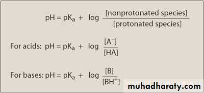 The relationship of pKa and the ratio of acid-base concentrations to pH is expressed by the Henderson-Hasselbalch equation: