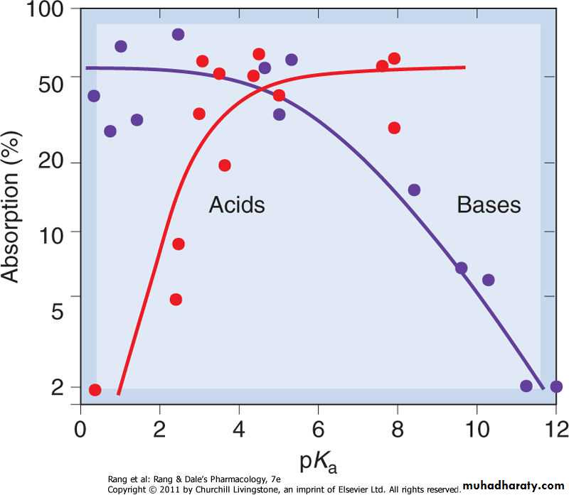 Absorption of drugs from the intestine, as a function of pKa, for acids and bases. Weak acids and bases are well absorbed; strong acids and bases are poorly absorbed.
