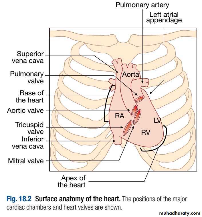 On the right, the RA is joined by superior and inferior venae cavae, and the lower right border is made up by the RV .