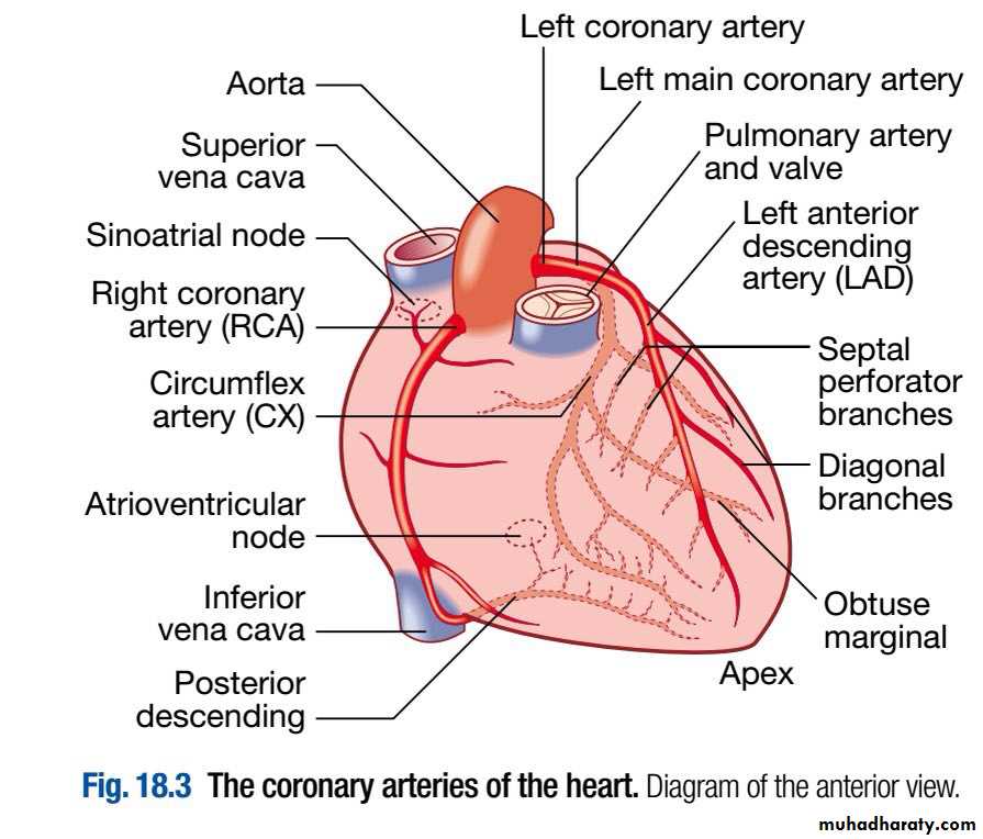 The left main and right coronary arteries arise from the left and right coronary sinuses of the aortic root, distal to the aortic valve.Within 2.5cm of its origin, the left main coronary artery divides into the left anterior descending artery (LAD), which runs in the anterior interventricular groove, and the left circumflex artery (CX), which runs posteriorly in the atrioventricular groove.