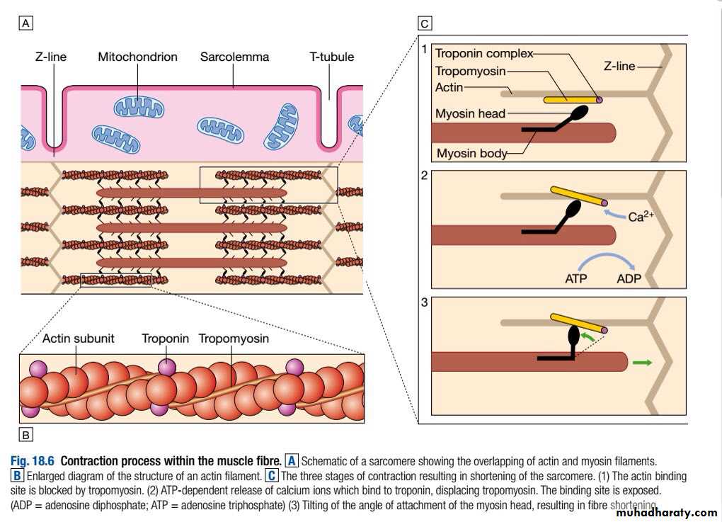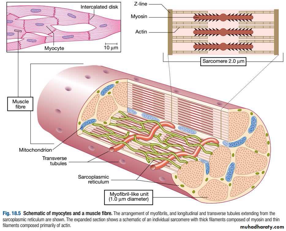 The basic unit of contraction is the sarcomere (2 μm long), which is aligned to those of adjacent myofibrils, giving a striated appearance due to the Z-lines. Actin filaments are attached at right angles to the Z-lines and interdigitate with thicker parallel myosin filaments.