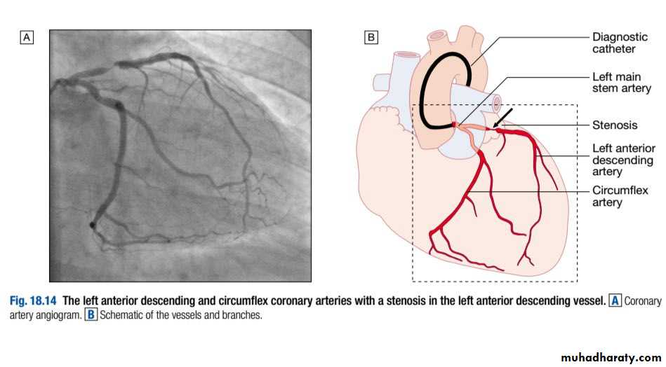 Coronary angiography is the most widely performed procedure, in which the left and right coronary arteries are selectively cannulated and imaged, providing information about the extent and severity of coronary stenoses, thrombus and calcification .