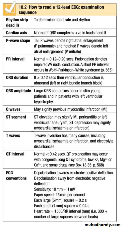 The ECG is used to assess cardiac rhythm and conduction.It provides information about chamber size and is the main test used to assess for myocardial ischemia and infarction.
