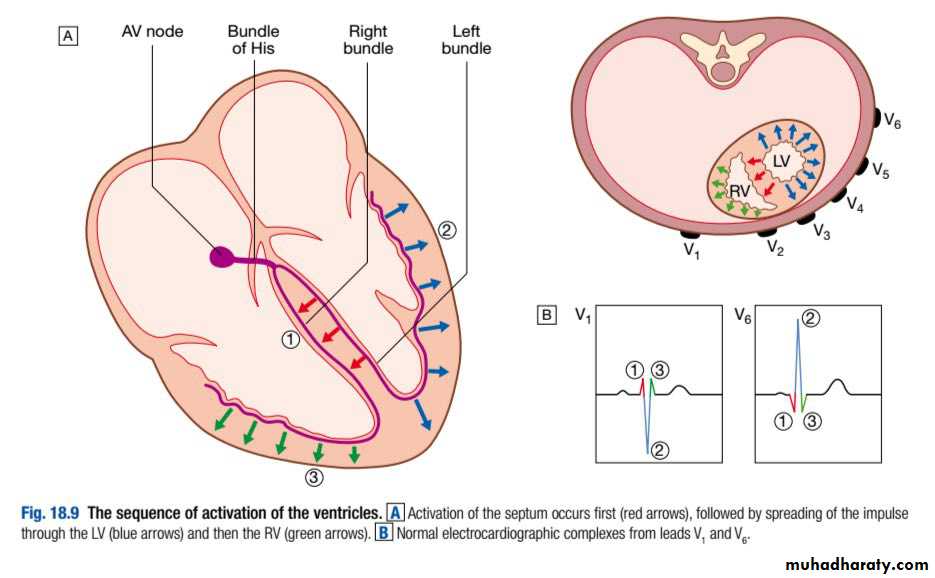 Depolarisation of the interventricular septum occurs first and moves from left to right; this generates a small initial negative deflection in lead V6 (Q wave) and an initial positive deflection in lead V1(R wave).The second phase of depolarisation is activation of the body of the LV, which creates a large positive deflection or R wave in V6 (with reciprocal changes in V1).