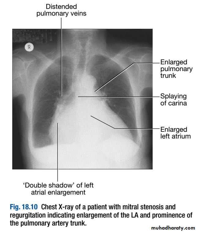 - Left atrial dilatation results in prominence of the left atrial appendage, creating the appearance of a straight left heart border, a double cardiac shadow to the right of the sternum, and widening of the angle of the carina (bifurcation of the trachea) as the left main bronchus is pushed upwards.