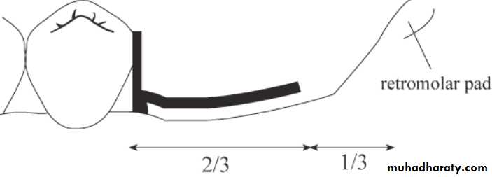 The minor connector for the mandibular distal extension base should extend posteriorly about two-thirds the length of the edentulous ridge and should have elements on both lingual and buccal surfaces.