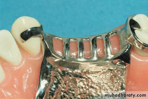 Gridwork minor connectors that connect the denture base and teeth to the major connector.