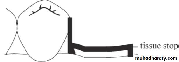 Tissue stop : a small projection of metal at the distal end of an extension base frame that contacts the cast and prevents downward movement of the plastic retention area during packing with resin