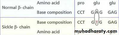 • Sickle Cell Disease• Hemoglobin S (Hb S) is the result of a single base pair change, thymine for adenine, at the 6th codon of the β-globin gene. This change encodes valine instead of glutamine in the 6th position in the β-globin molecule.