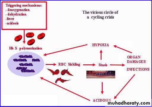 • vaso-occlusive episode is the cardinal clinical feature of sickle cell anemia , The pain may occur in any part of the body, but most often occurs in the chest, abdomen, or extremities. These painful episodes are often abrupt .• The pathogenesis of pain is disruption of blood flow in the microvasculature by sickle cells, resulting in tissue ischemia. Precipitating causes of painful episodes can include physical stress, infection, dehydration, hypoxia, systemic acidosis, exposure to cold, and swimming in non-heated water for prolonged periods.