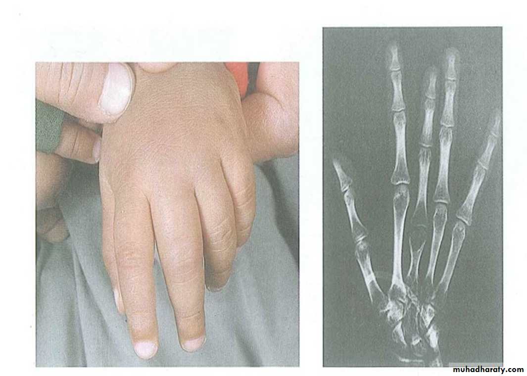 • Dactylitis, often referred to as hand-foot syndrome, is frequently the 1st manifestation of pain in children with sickle cell anemia, presents with symmetric swelling of the hands and/or feet. Unilateral dactylitis can be confused with osteomyelitis and requires careful consideration because treatment of the former requires palliation with pain medication, often acetaminophen with codeine, whereas osteomyelitis requires at least a 4–6 wk course of IV antibiotics .