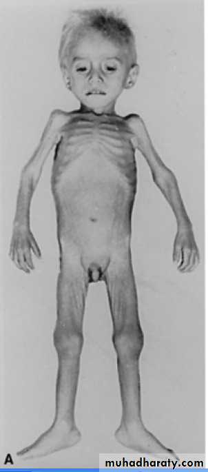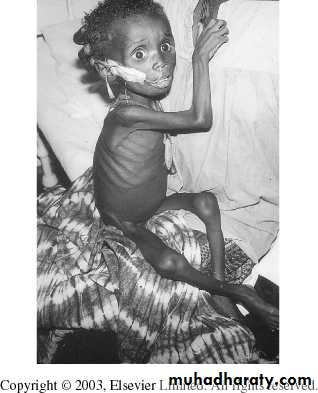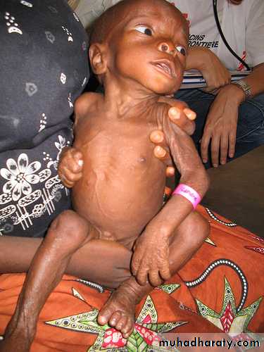 Marasmus; inadequate intake of protein and calories (absence of odema)