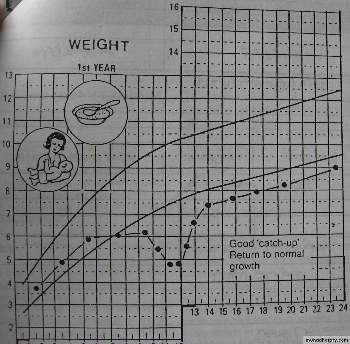 The child’s dietary intake increases steadily, the frequency of feeding is reduced and weight gain is rapid, up to 20 times normal, on average 10 g/kg/day.