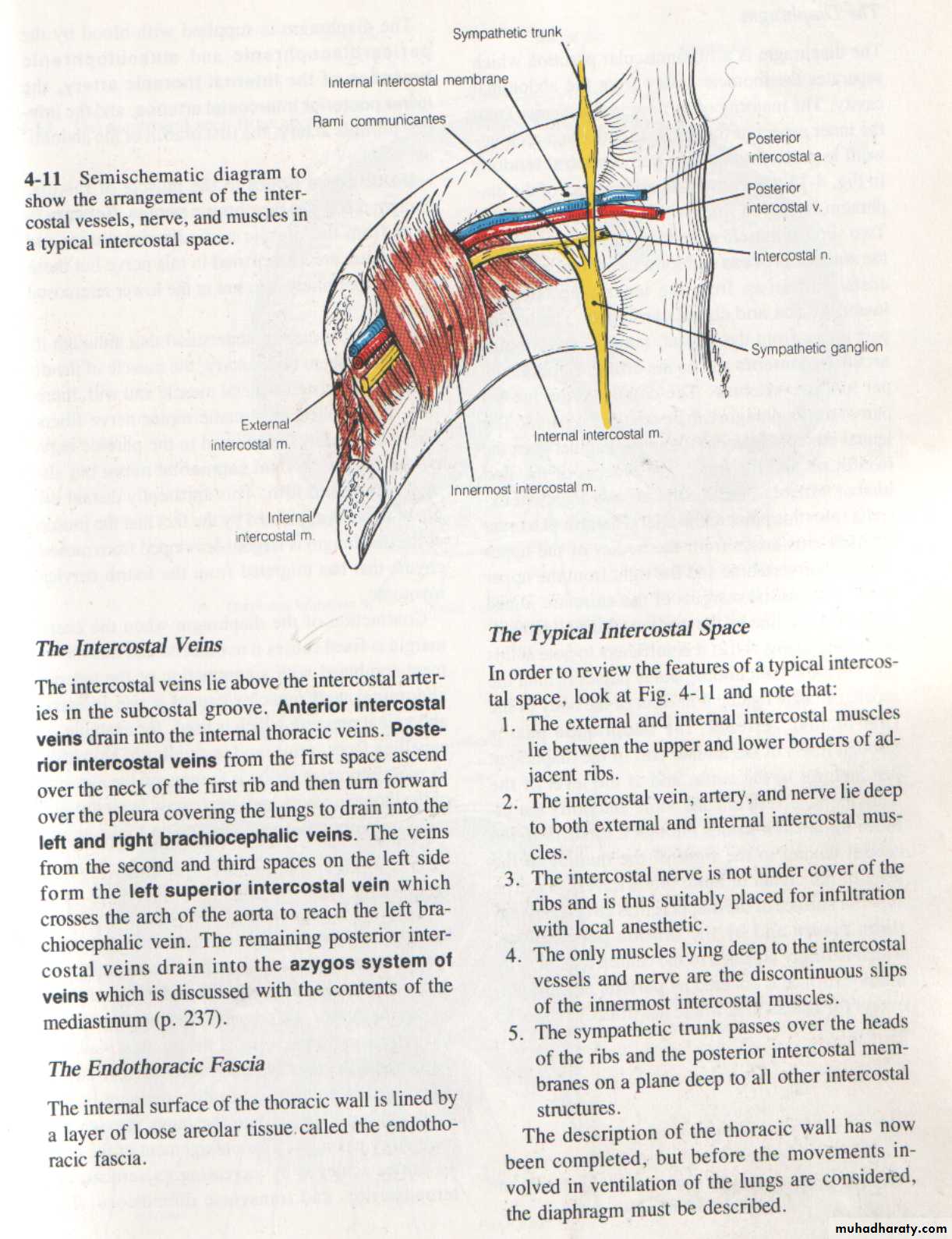 Also a separate and distinct muscle may be found in the plane of the innermost intercostal muscles and may be thought of as a continuation of that layer of intercostal musculature called intercostalis intemus (e.g., the transversus thoracis and subcostal muscles).