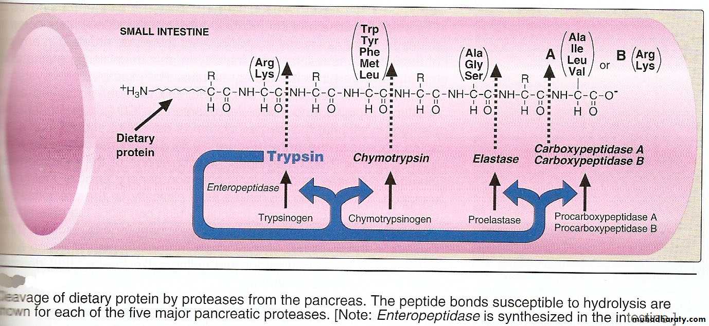 Intestine : In the intestine luminal surface contain aminopeptidases that repeatedly cleaves the oligopeptide to produce free AA and small peptide.