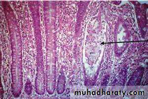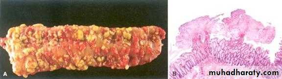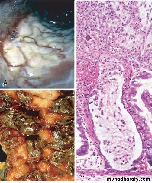 Clostridium difficile colitis. A, The colon is coated by tan pseudomembranes composed of neutrophils, dead epithelial cells, and inflammatory debris (endoscopic view). B, Pseudomembranes . C, Typical pattern of neutrophils emanating from a crypt is reminiscent of a volcanic eruption