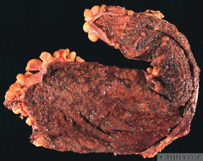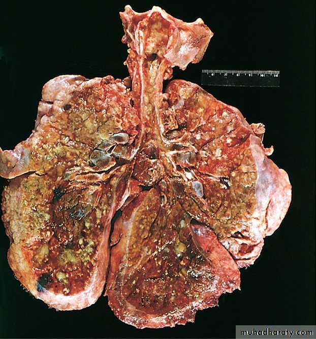Lungs of a cystic fibrosis. Extensive mucous plugging the tracheobronchial tree.The parenchyma is consolidated by both secretions &pneumonia; the greenish discoloration is the Pseudomonas infections.