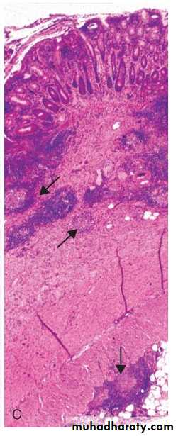 Transmural Crohn disease with submucosal and serosal granulomas (arrows).