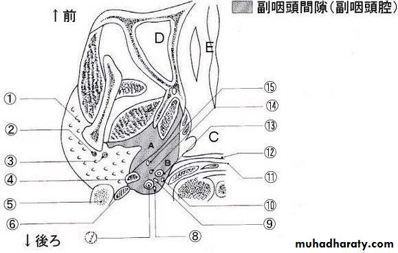 • -Laterally into the parapharyngeal space involving the last 4 cranial nerves.