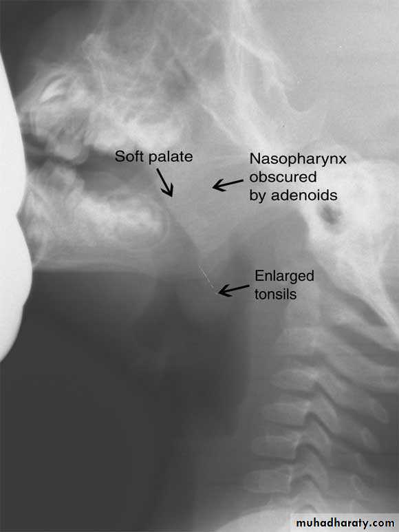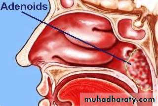 This extends from the base of the skull to the hard palate.At the junction of the roof and posterior wall lies a small mass of lymphoid tissue called adenoids (nasopharyngeal tonsil).
