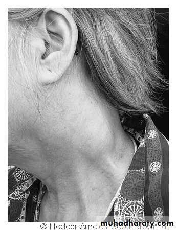 Bi-modal age distribution with the first age peak at 2nd decade and the other peak at 5th – 7th decade of life. It affects males more than females-Cervical lymphadenopathy : is often the presenting feature which may be unilateral or bilateral.